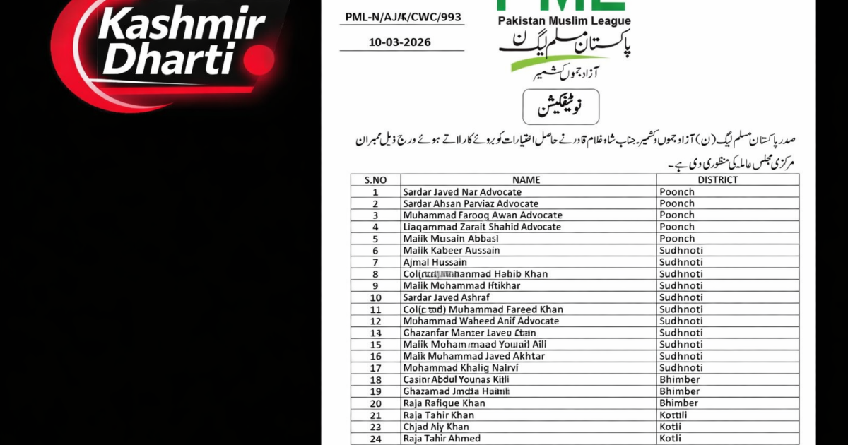 مظفرآباد(دھرتی نیوز )پاکستان مسلم لیگ (ن) آزاد جموں و کشمیر کے صدر شاہ غلام قادر نے پارٹی آئین کے تحت اختیارات استعمال کرتے ہوئے مختلف اضلاع سے تعلق رکھنے والی سیاسی شخصیات کو مرکزی کونسل کا رکن نامزد کر دیا ہے۔جاری کردہ نوٹیفکیشن کے مطابق ضلع پونچھ، سدھنوتی، بھمبر اور کوٹلی سے مجموعی طور پر 24 رہنماؤں کو پارٹی کی مرکزی کونسل میں شامل کیا گیا ہے۔نوٹیفکیشن کے مطابق پونچھ سے سردار جاوید ناز ایڈووکیٹ، سردار احسن پرویز ایڈووکیٹ، محمد فاروق اعوان ایڈووکیٹ، محمد زرایت شاہد ایڈووکیٹ اور لیاقت حسین عباسی کو مرکزی کونسل کا رکن مقرر کیا گیا ہے۔اسی طرح سدھنوتی سے ملک کبیر حسین، اجمل حسین، کرنل (ر) محمد حبیب خان، ملک محمد افتخار، سردار جاوید اشرف، کیپٹن (ر) محمد فرید خان، محمد وحید عارف ایڈووکیٹ، غضنفر منظور ایڈووکیٹ، ملک محمد جاوید اختر، سردار عبد الخالق نیلوی، محمد یونس کیانی، سردار غلام شبیر اور سردار امداد حسین ایڈووکیٹ کو نامزد کیا گیا ہے۔ضلع بھمبر سے یاسین حیدر راجہ اور راجہ عبد الخالق جبکہ ضلع کوٹلی سے راجہ طاہر خان، راجہ رفیق خان، راجہ اسجد علی اور راجہ زبیر احمد کو مرکزی کونسل میں شامل کیا گیا ہے۔